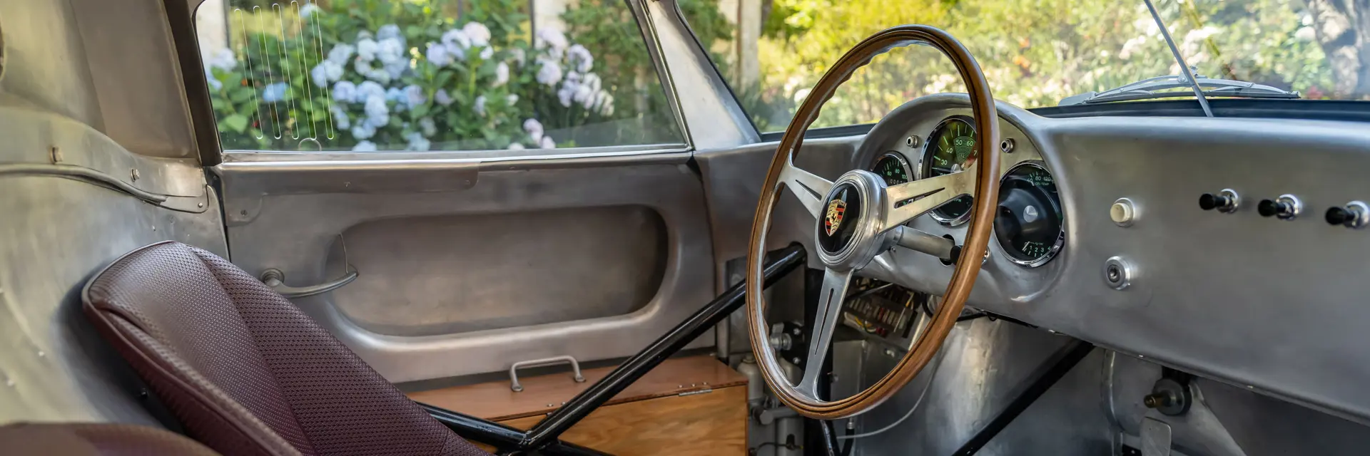 Inside, even casual observers could perceive the weight-saving regime. A utilitarian cabin was common for Porsche racers; so-called “speed holes” can be seen dotting the handbrake and shifter brace. The windows were crafted from lightweight Plexiglas, which allowed them to be ventilated. At the official weigh-in before the Le Mans race, the sprightly Porsche totaled a scant 595 kilograms. This slim curb weight allowed for maximum maneuverability and acceleration.