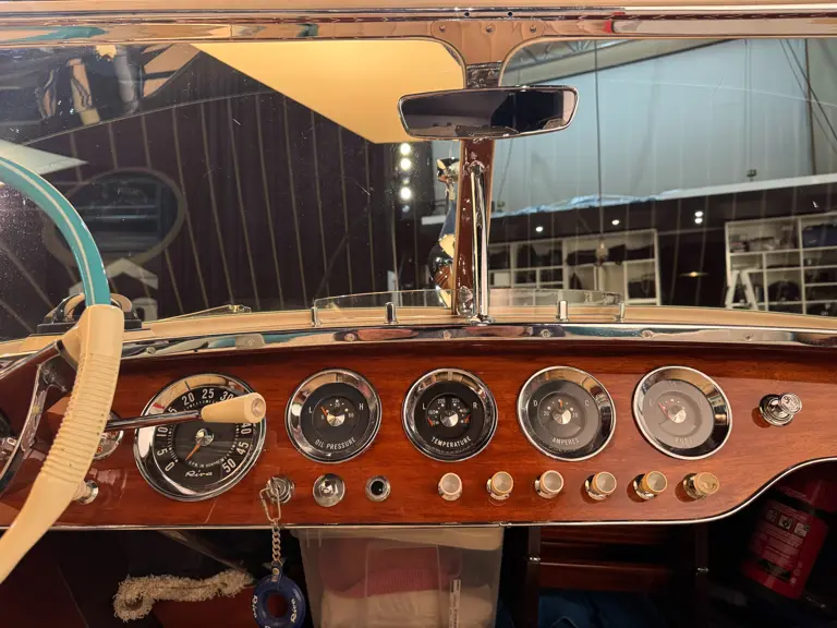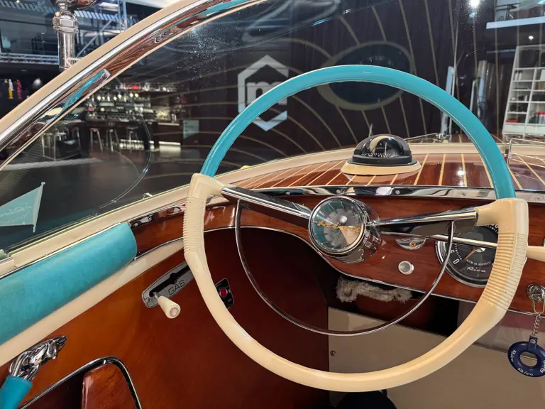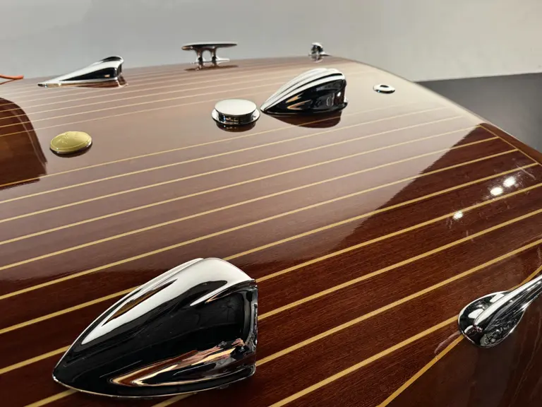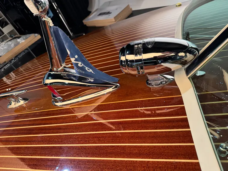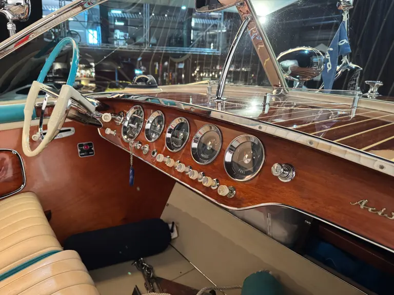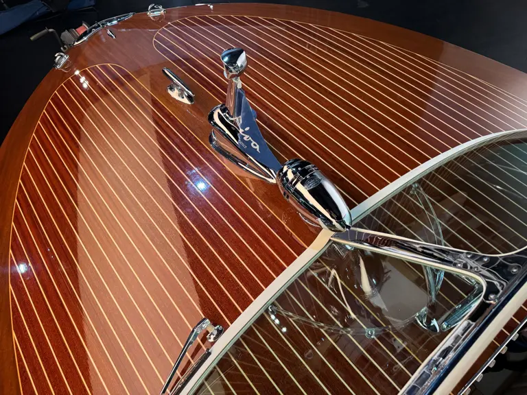 Now presented in restored condition, the Riva has been repowered with a modern MerCruiser V-8 producing 260 horsepower, enabling easy and worry-free cruising. The boat has widely appeared in media, including fine art pieces by René Staud, as “Vittoria” in a 2015 advertisement for the Maserati Levante, and it was also featured in (and appears on the covers of) both the 2019 book Ultimate Toys for Men and 2024’s Riva: Magic of the Legend. In 2016, the Riva was temporarily rechristened “Sei Bella” and starred in a music video for a romantic song of the same name by Enzo Amos. During filming, the Ariston looked fully at home among the gondolas in Venice’s Grand Canal.