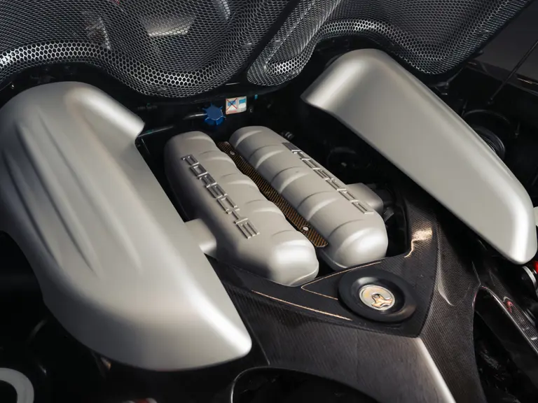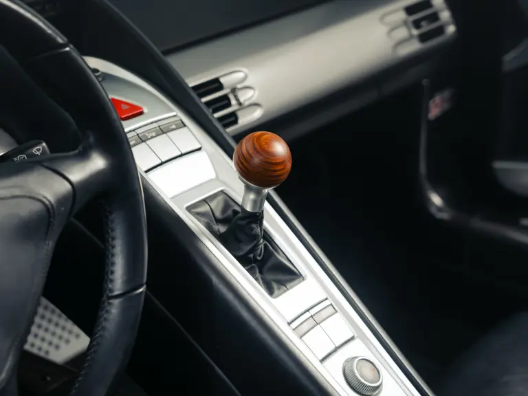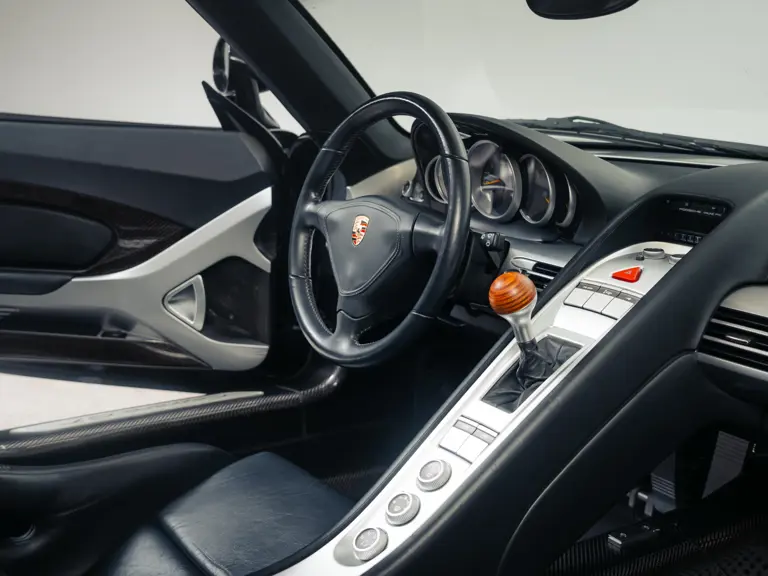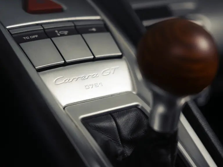 - Equipped with Porsche’s race-derived V-10 engine; paired with a six-speed manual transmission with the lever topped by the Carrera GT’s signature wooden gear knob