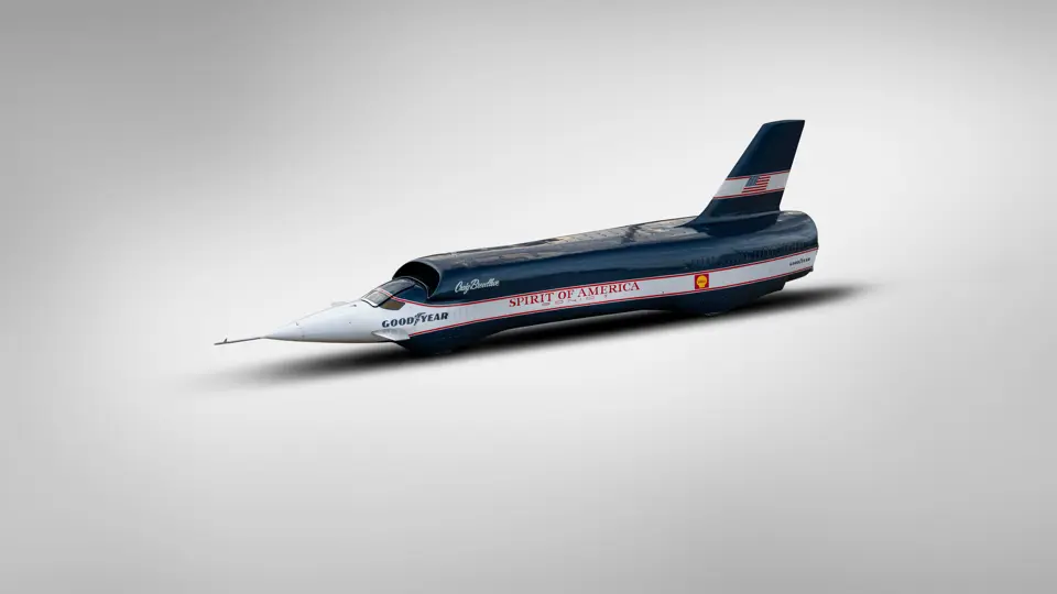 But the battle for extreme velocity truly accelerated, so to speak, when California native Craig Breedlove achieved 407.447 mph in his Spirit of America in August 1963. Previous record-setting machines had used a range of powerplants, but all ultimately put power to the ground through driven wheels. Breedlove’s sleek craft was propelled solely by thrust from a GE J47 turbojet engine, as used on the F-86 Sabre fighter plane. On Utah’s Bonneville Salt Flats, land speed had entered its Jet Age.