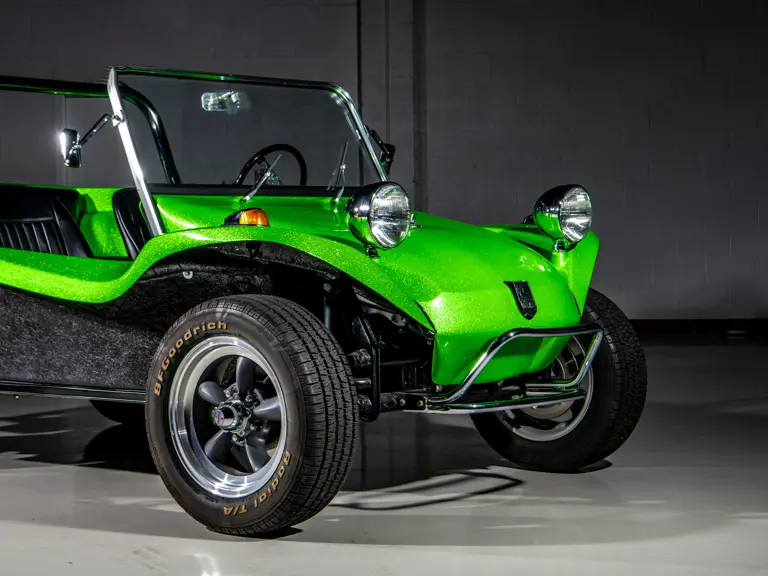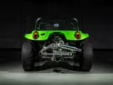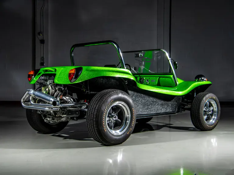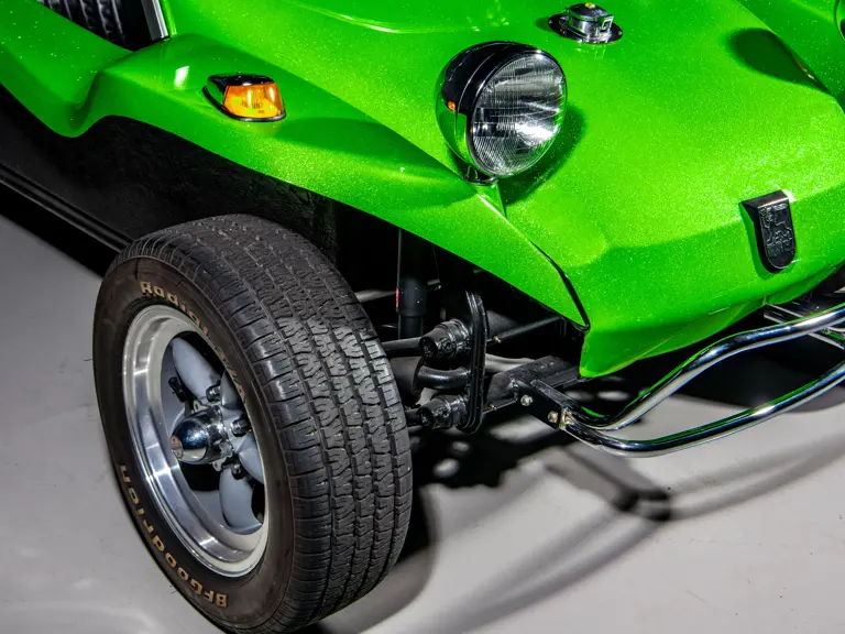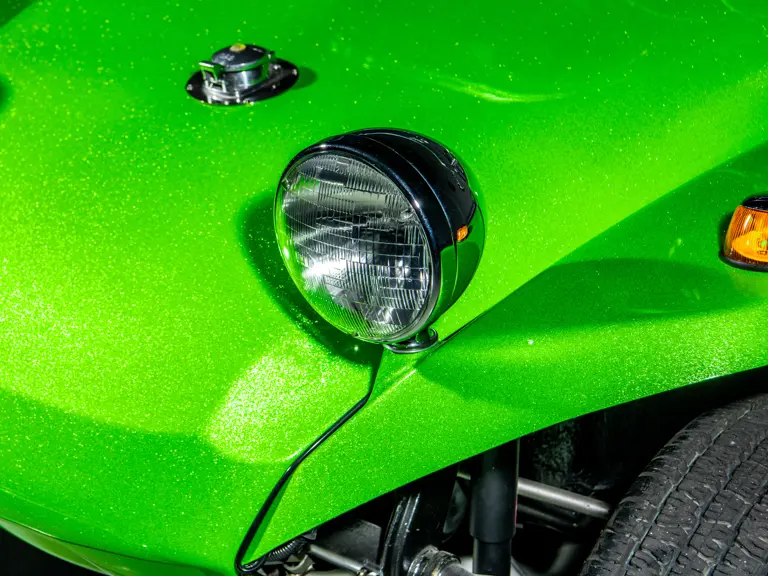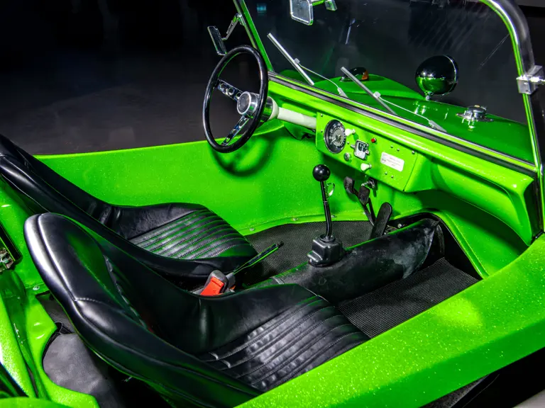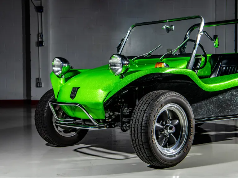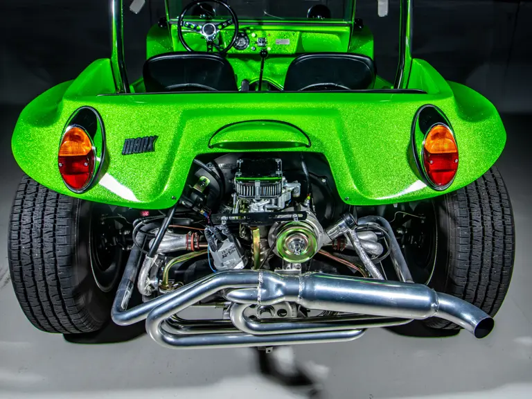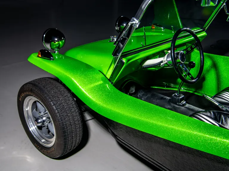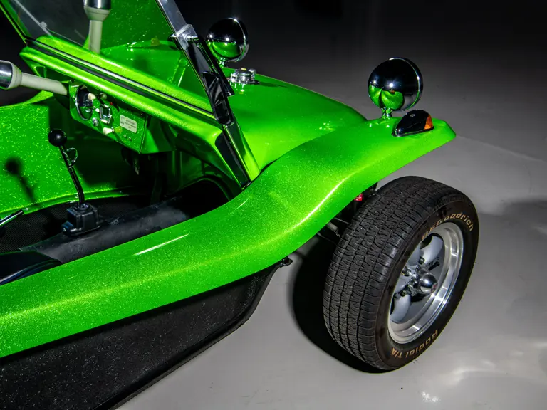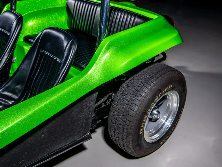 Approximately $60,000 was reportedly invested the Manx’s complete renewal. This included the fitment of a 1,914-cubic-centimeter flat-four engine by Powerhaus VW of Torrence, California, which is said to produce roughly 100 horsepower. This is mated to a Rancho Type 1 Pro Street VW Bug swing axle transaxle with 4:12 gearing. Period-appropriate touches include an EMPI trigger shifter, black-trimmed bucket seats, and American Racing Torq-Thrust wheels wrapped in BF Goodrich radial tires. As a final touch, the Manx was finished in an eye-grabbing bright green metallic.