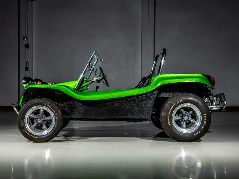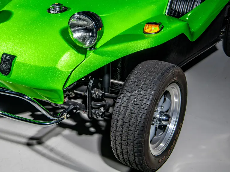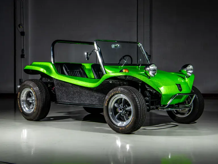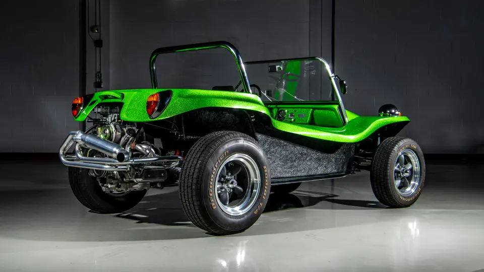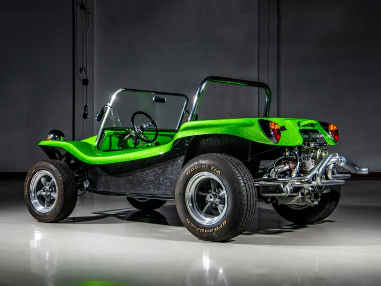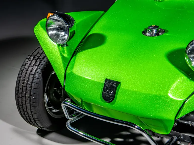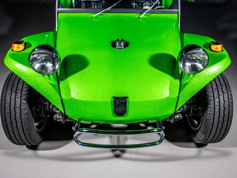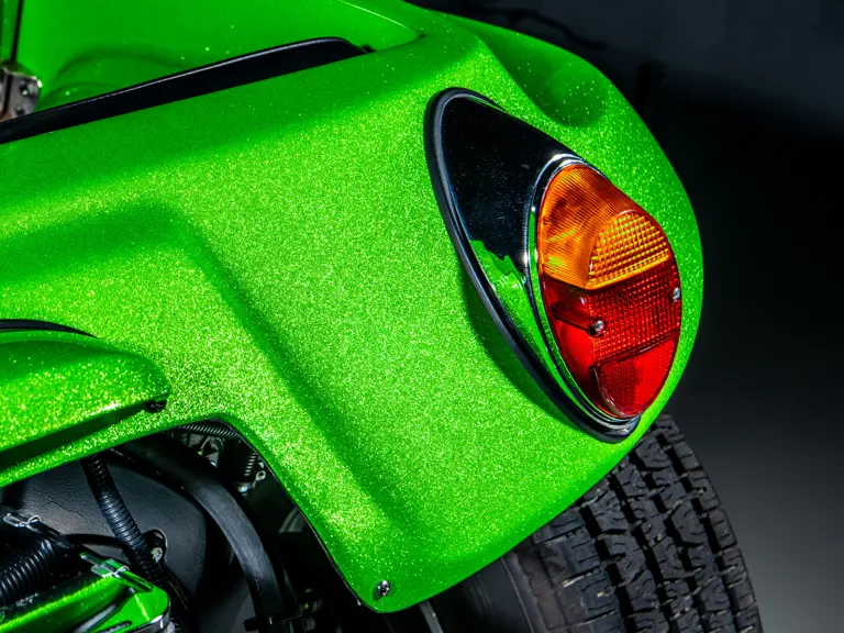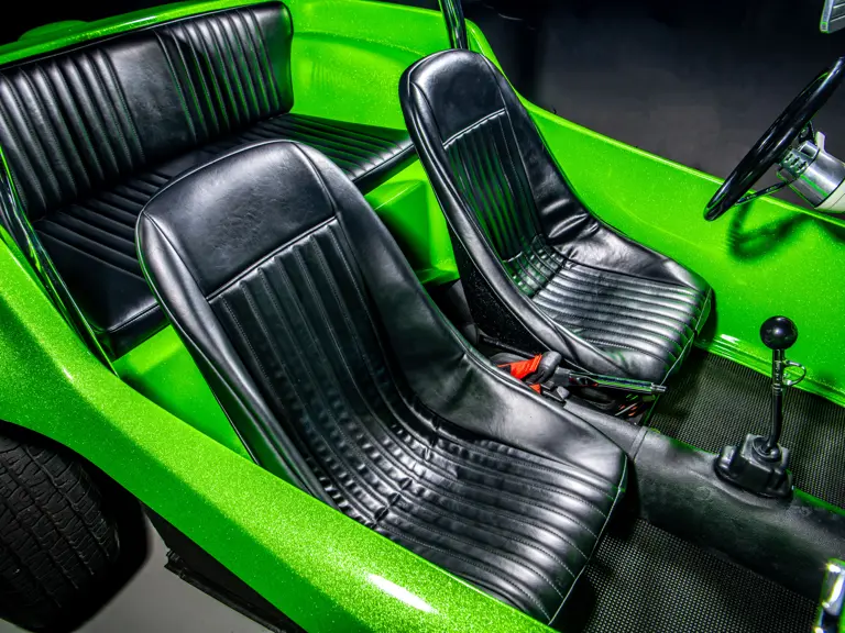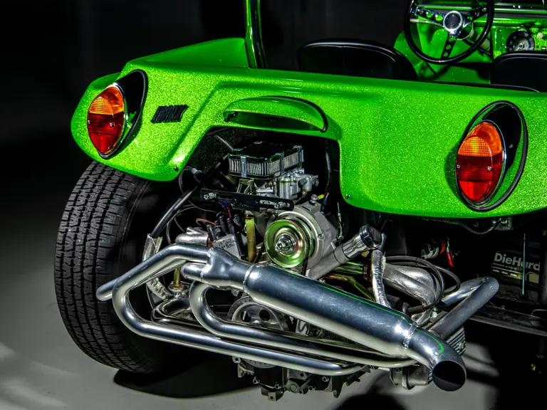 Approximately $60,000 was reportedly invested the Manx’s complete renewal. This included the fitment of a 1,914-cubic-centimeter flat-four engine by Powerhaus VW of Torrence, California, which is said to produce roughly 100 horsepower. This is mated to a Rancho Type 1 Pro Street VW Bug swing axle transaxle with 4:12 gearing. Period-appropriate touches include an EMPI trigger shifter, black-trimmed bucket seats, and American Racing Torq-Thrust wheels wrapped in BF Goodrich radial tires. As a final touch, the Manx was finished in an eye-grabbing bright green metallic.