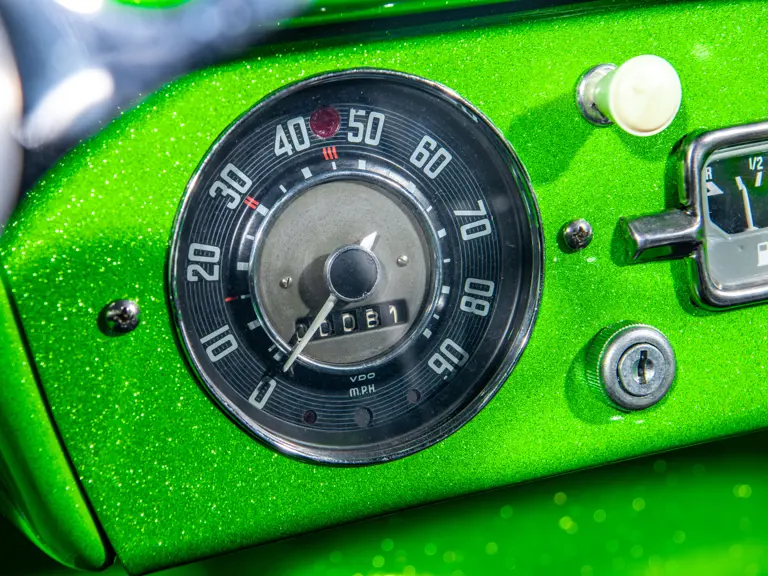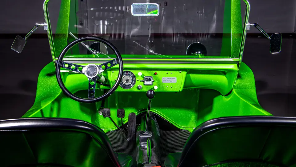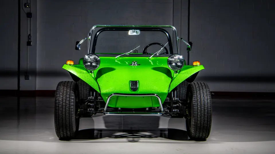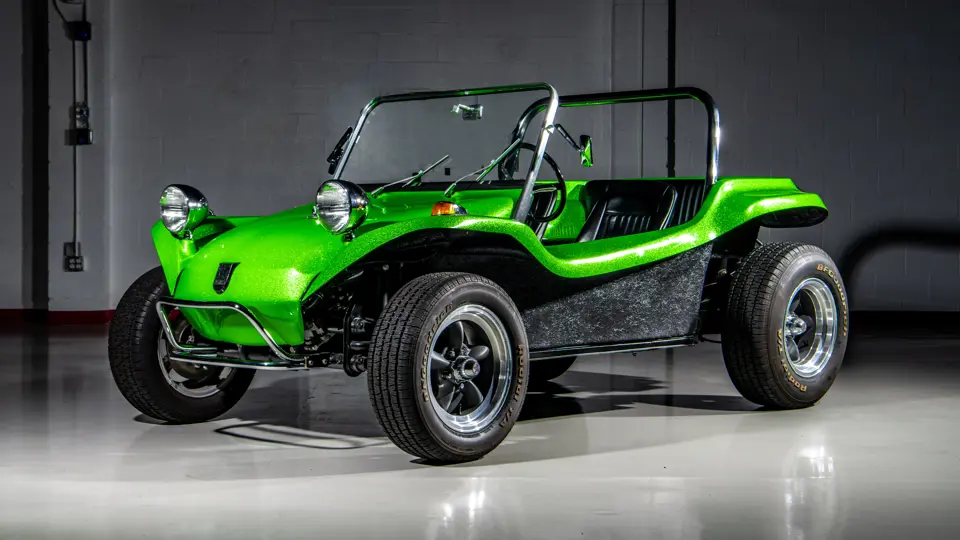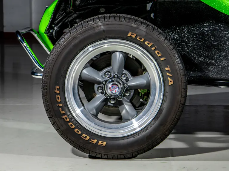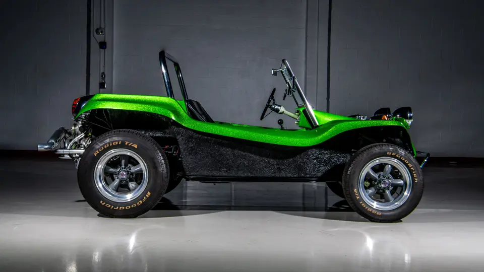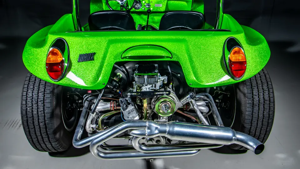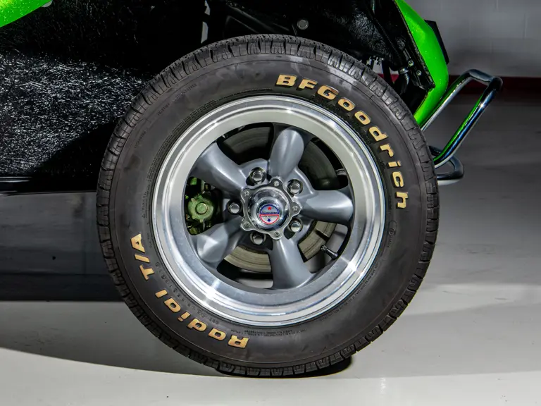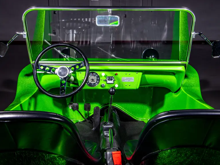 Approximately $60,000 was reportedly invested the Manx’s complete renewal. This included the fitment of a 1,914-cubic-centimeter flat-four engine by Powerhaus VW of Torrence, California, which is said to produce roughly 100 horsepower. This is mated to a Rancho Type 1 Pro Street VW Bug swing axle transaxle with 4:12 gearing. Period-appropriate touches include an EMPI trigger shifter, black-trimmed bucket seats, and American Racing Torq-Thrust wheels wrapped in BF Goodrich radial tires. As a final touch, the Manx was finished in an eye-grabbing bright green metallic.
