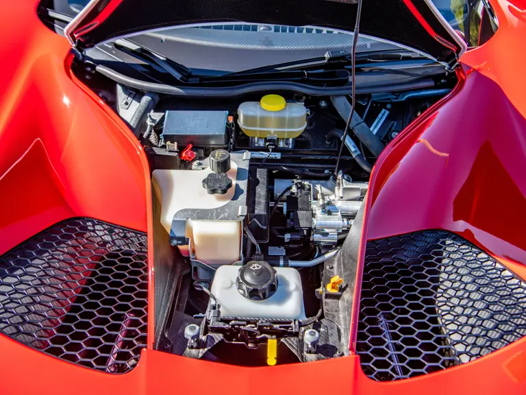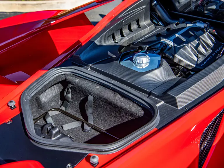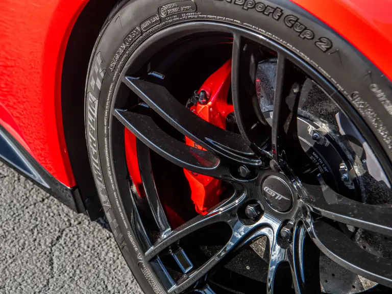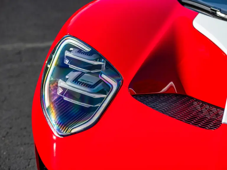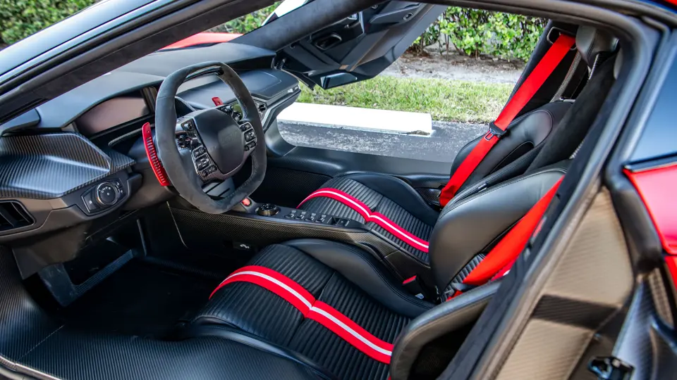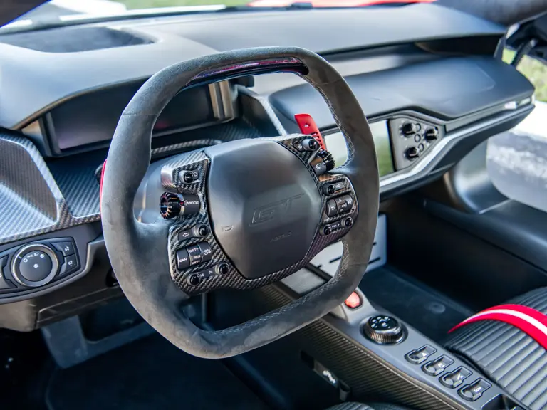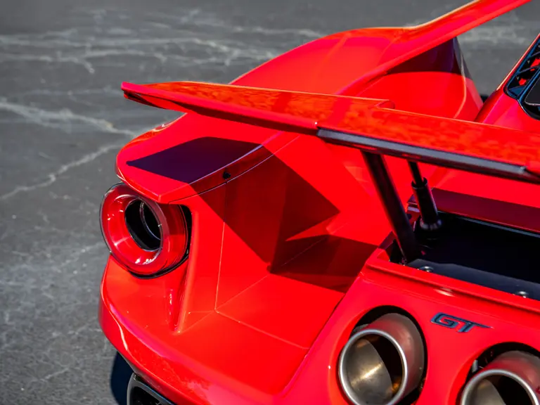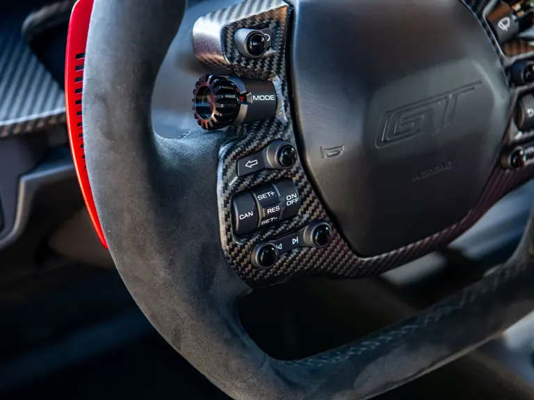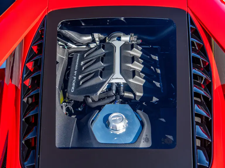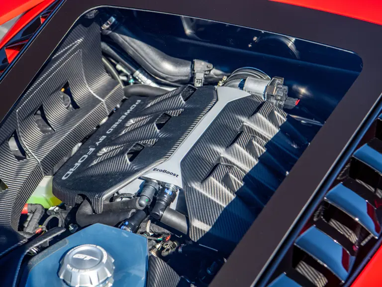 Ford tapped Multimatic, the Ontario-based firm—which helped develop the Aston Martin One-77, Porsche 963, and RUF CTR3—for its all-new GT. The design featured a custom carbon fiber monocoque chassis with front and rear aluminum subframes. Power came not from a V-8 like the GT’s competitors ran, but Ford’s versatile 3.5-liter V-6 Ecoboost engine, augmented with twin-turbochargers and channeled through a seven-speed Getrag dual-clutch gearbox. A hydraulically adjustable pushrod suspension kept primary components inboard to optimize aerodynamics of the carbon fiber bodywork.