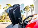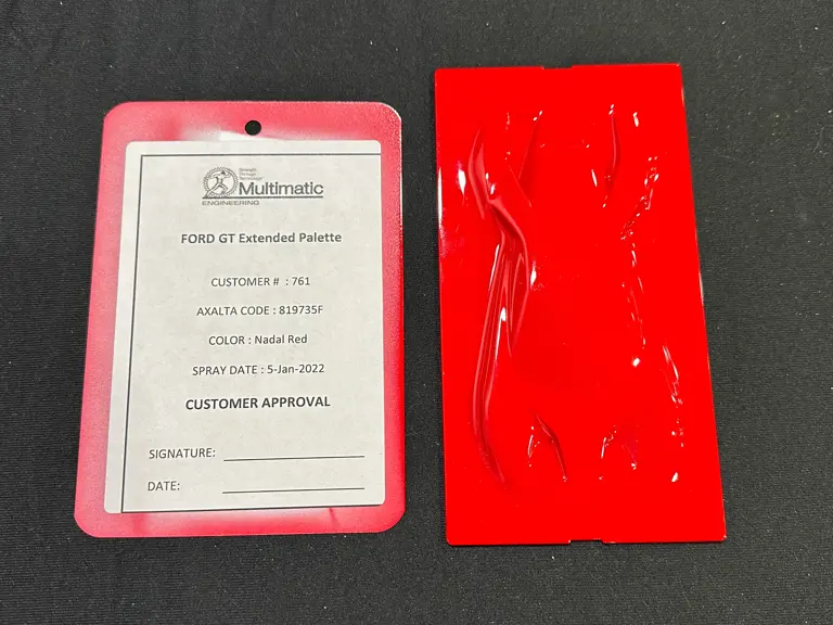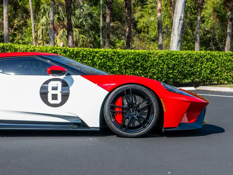 Driven by a passion for iconic footwear, the original owner of this unique Ford GT commissioned one-off livery inspired by the Nike Air Jordan 1 sneaker. Correspondence from Multimatic details the in-depth design process, which involved various proposals featuring different interpretations of color blocks and graphics evoking the classic Nike shoe. The exterior features a special hue, dubbed Nadal Red, as the primary color, with Frozen White on the doors and hood. Gloss Black lower bodywork and wheels visually ground the presentation, while red brake calipers provide contrast while also coordinating with the main body color.