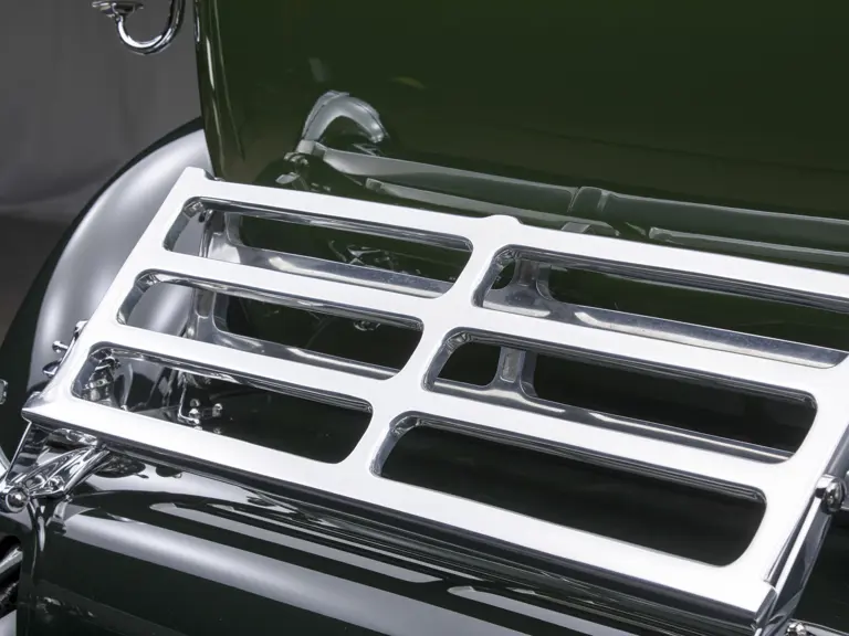 Many of the best of these designs flowed from the pencil of Franklin Q. Hershey, a slim, bespectacled artist in Murphy’s studio. Hershey excelled at designs that formed a single shape, with few ostentatious additional chrome folderols to distract the eye. This was never better demonstrated than on the dual-cowl phaeton design he drew for the Model J. The rear cowl, a cumbersome addition usually to even the best designs of this type, was exceptionally well integrated, fitting virtually flush with the tops of the doors. The rear windshield and the cowl itself were both split down the center, and each half of the cowl would lift to permit a passenger in and out—a feature that came to be known, colloquially, as the “butterfly” cowl, and became a signature of Murphy dual-cowl phaetons of this era.