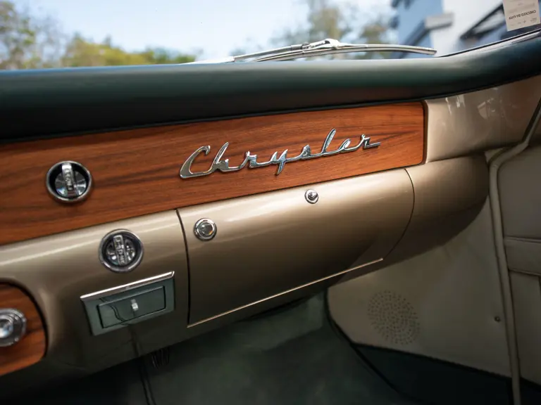 Shortly after the Chrysler’s acquisition, Rare Classics Restorations of Florida carried out a complete restoration to the highest possible standards. The coachbuilt car was carefully disassembled; bodywork was stripped to bare metal and all corrosion rectified; and its correct-type Hemi V-8, as well as all other mechanical systems, were completely rebuilt. Just as when new, its exterior is finished in a champagne-gold color similar to the Ferrari shade of Grigio Ingrid; its roof is now trimmed in highly attractive English Hunt Club Green leather, while the interior features English Ivory upholstery with green leather accents and green Wilton wool carpeting. A rosewood dashboard beautifully completes the interior.