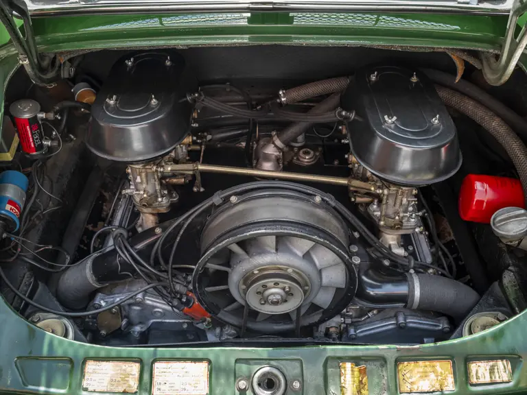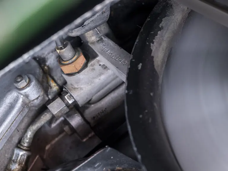 When Walker acquired the 911 in 2009 following a lightning trip to the Pacific Northwest, it remained much as it was when it was first delivered. It wears a repaint in its factory-correct Irish Green and retains its numbers-matching flat-six (it is currently fitted with an earlier type 901/0 gearbox numbered 100717). The original Black leatherette interior, original carpets, and wood-rimmed steering wheel boast the authentic patina that comes only from years of careful use. It still rides on the gray-coated steel wheels, sans hubcaps, installed by Walker after his purchase.