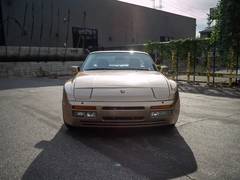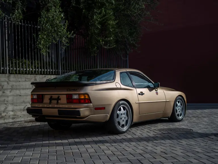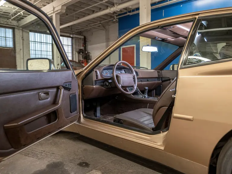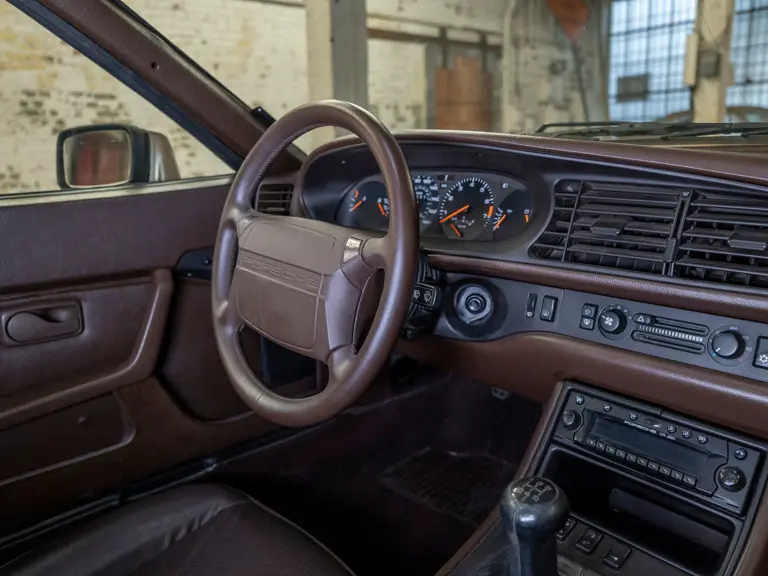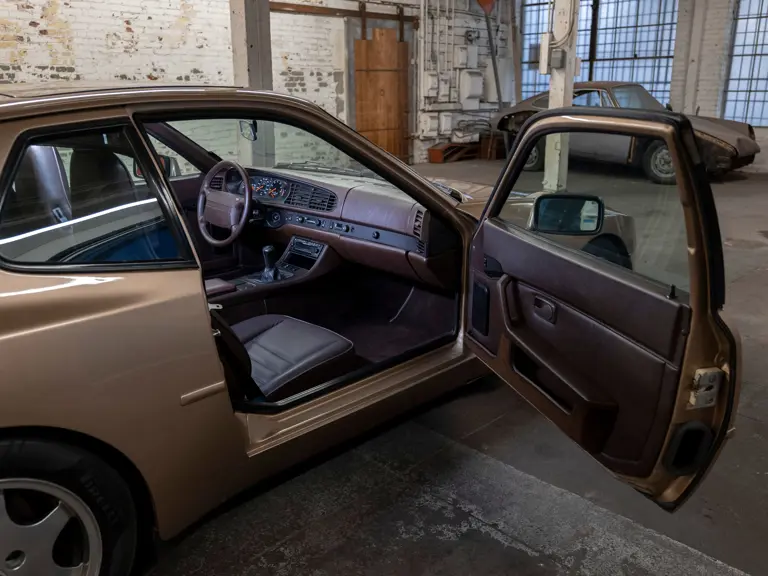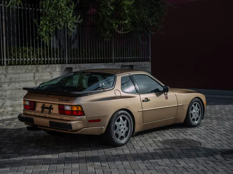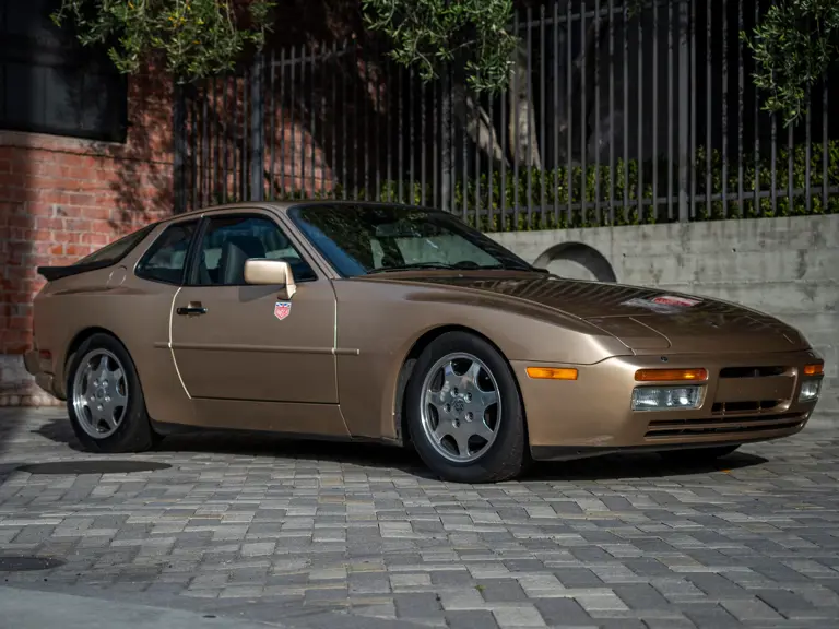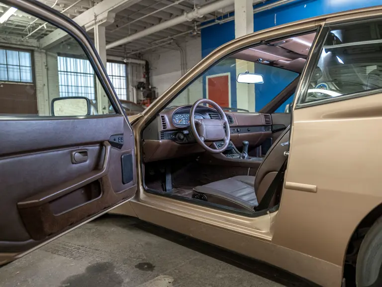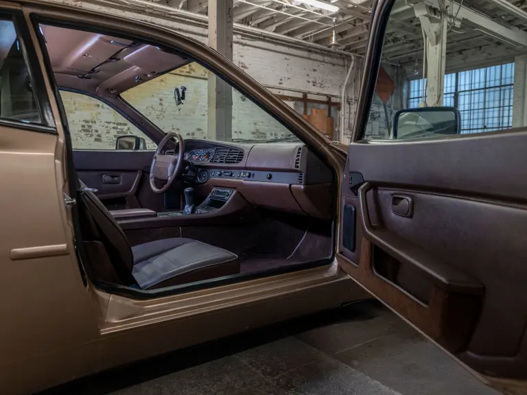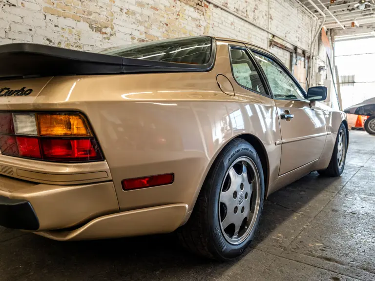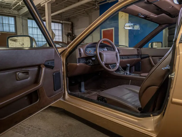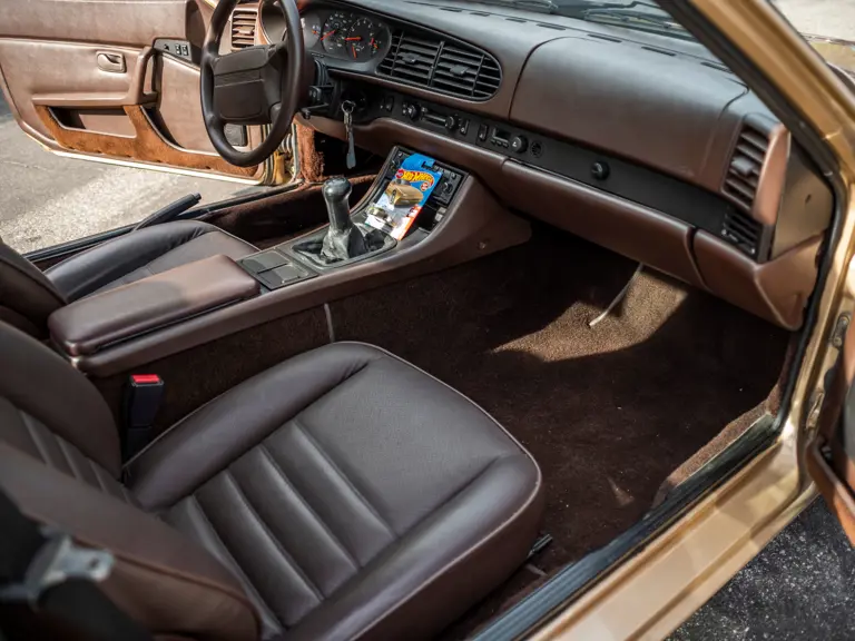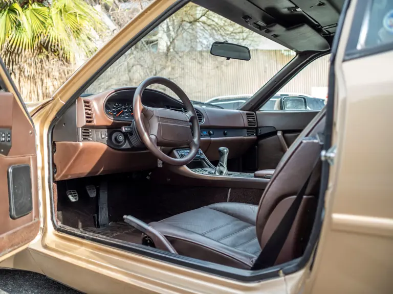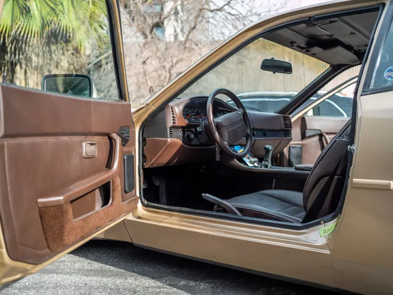 Reported by Magnus Walker to be a long-term California car, this 944 Turbo is finished in Almond Beige Metallic over brown partial leather trim. Equipped with a five-speed manual transaxle, sliding sunroof, and cruise control, its odometer read 131,913 miles at the time of cataloguing.