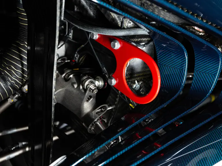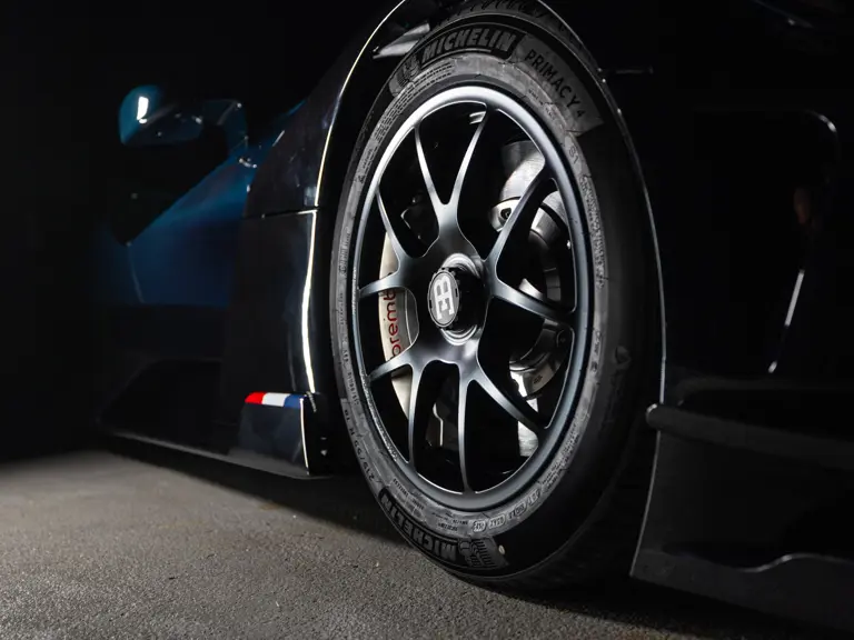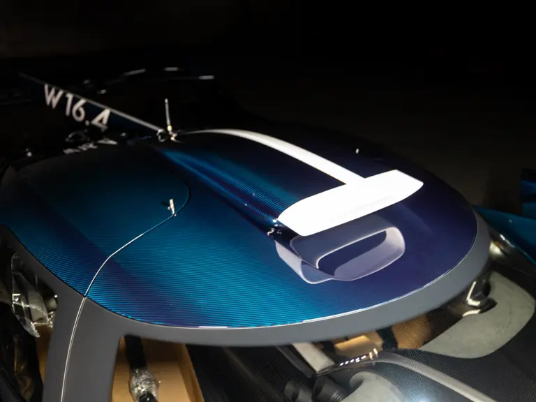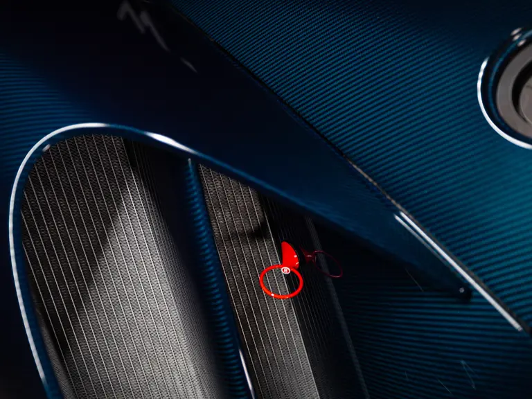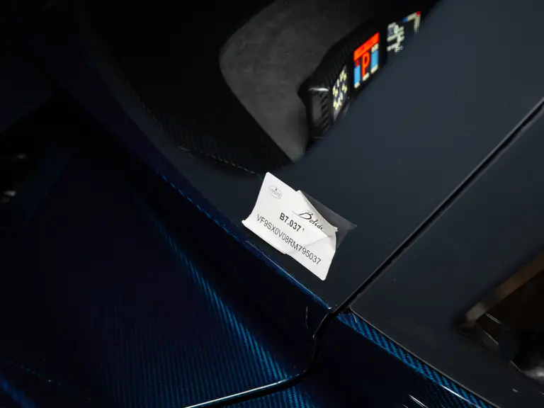 Offered here is one of the rarefied 40 examples produced. From the final specification of this car, which was decided in August 2023, the bodywork is primarily presented in show-stopping tinted Turquoise Carbon. This is complemented by the Black Carbon finish for the lower surfaces and rocker aero panel. As part of the extensive personalisation, the exterior features French flag motifs on the turning vanes behind the front wheels while Blanc was selected for the central air intake surround, “W16.4” and “Bugatti” script on the fin stabiliser and underside of the rear wing, plus the Bugatti logo on the rear wing endplates. In addition, the tow hook was configured in Italian Red while the fuel cap and exhaust deflector are Black. Further highlights include the Nocturne-painted wheels featuring Black centre caps plus the Black Carbon cover shrouding the mighty W16 powerplant.