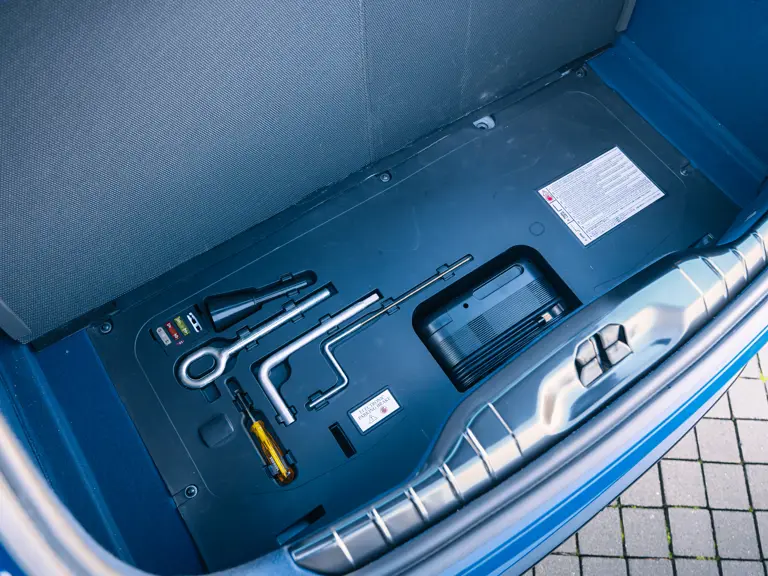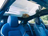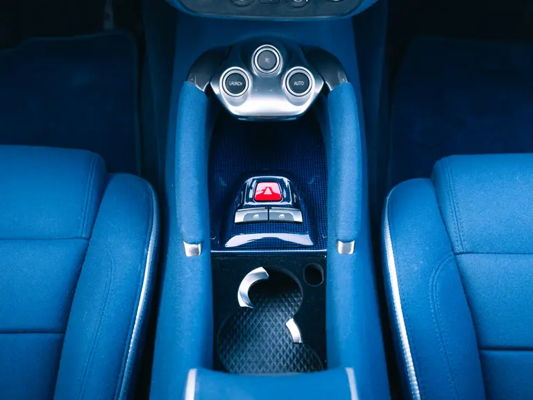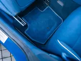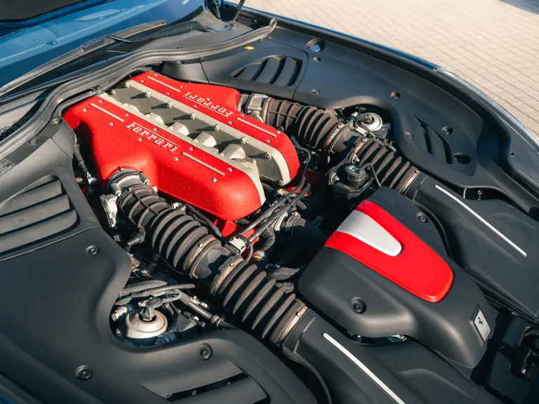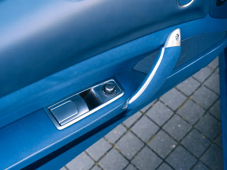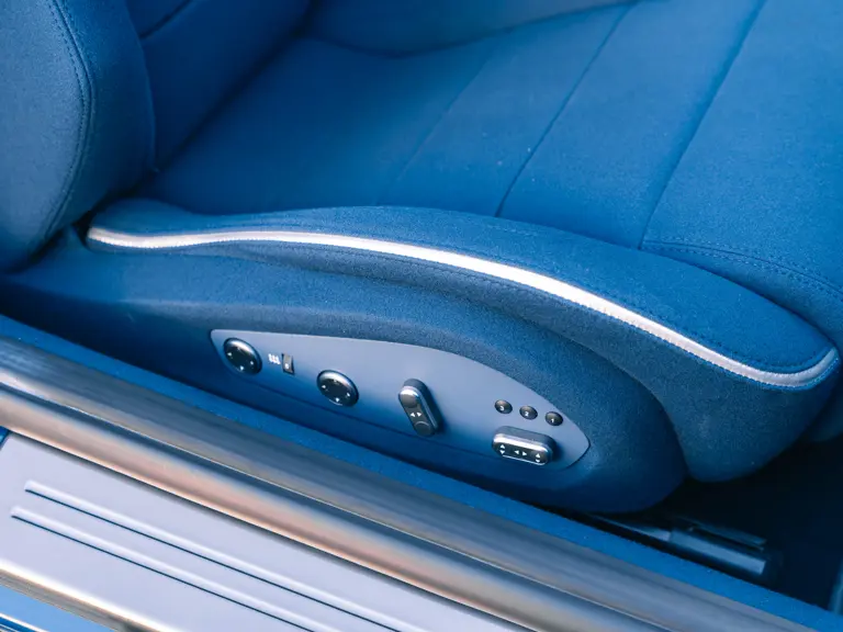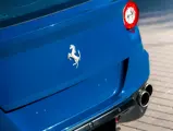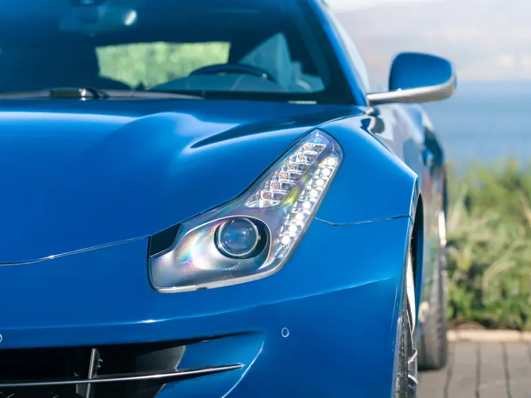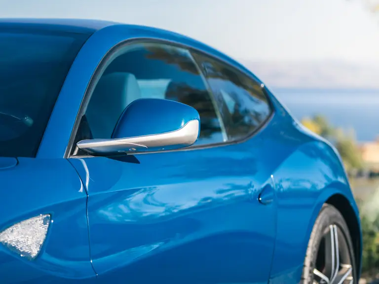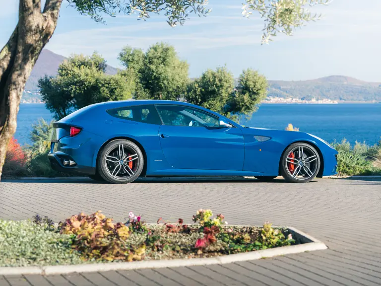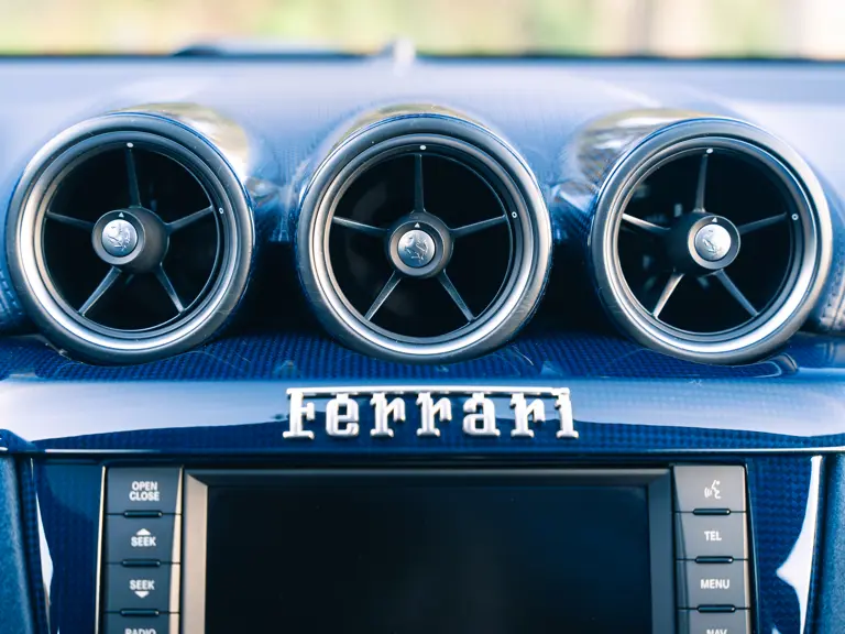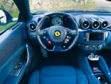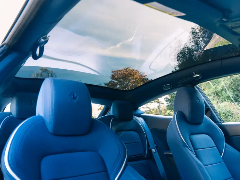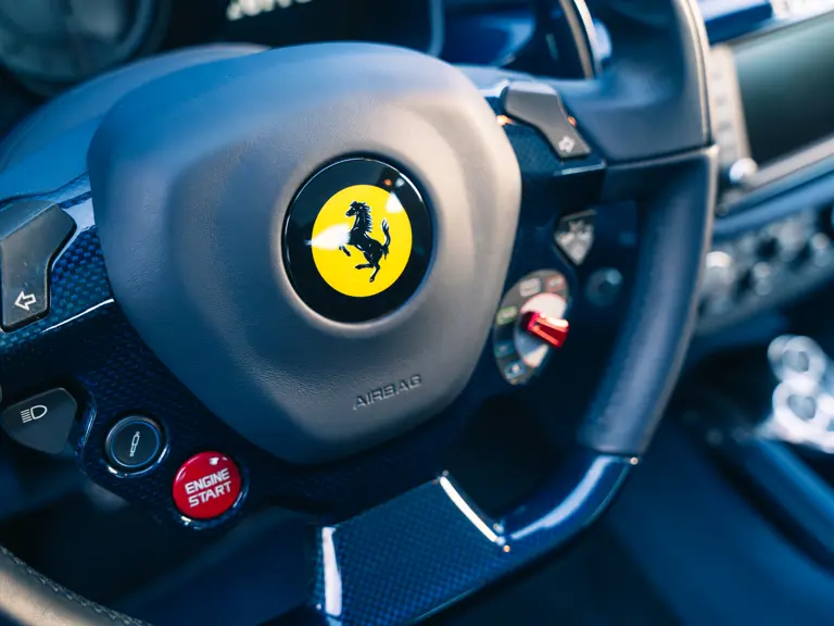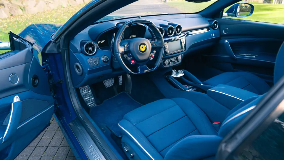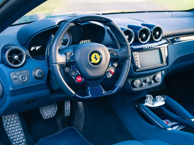 Cette magnifique Ferrari est immédiatement reconnaissable dans sa configuration unique. Outre une peinture spéciale Nuovo Blu, l’habitacle Blu bénéficie également d’un élément très rare dans les Ferrari modernes : une sellerie en tissu. Le tissu présente lui aussi une finition bleue qui rappelle la teinte extérieure de la FF. Tandis que des logos du cheval cabré sont brodés sur les appuie-tête, un passepoil contrasté blanc borde la sellerie et des éléments en fibre de carbone Blu complètent le look sportif. Un toit vitré panoramique toute longueur renforce l’impression de luxe et d’opulence de cette voiture de grand tourisme.