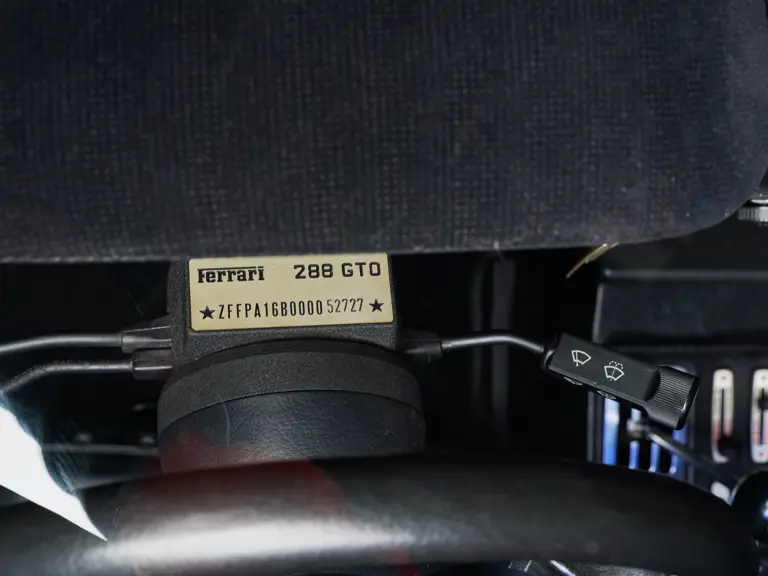 Accompagnée des manuels d'utilisation et d'une trousse à outils, et documentée par son carnet de garantie, ses factures d'entretien et son "libretto" italien, cette GTO est un exemplaire extrêmement pur de cette redoutable Ferrari conçue pour la compétition. La 288 GTO est de loin la plus rare de la série des hypercars Ferrari "Big Six" et n'apparaît presque jamais à la vente. Pour le collectionneur passionné de Ferrari cherchant à compléter son ensemble de "Big Six", ce châssis 52727 représente une opportunité sans pareille d'acquérir une légende.