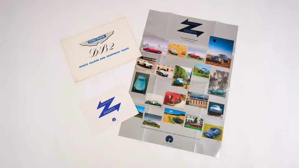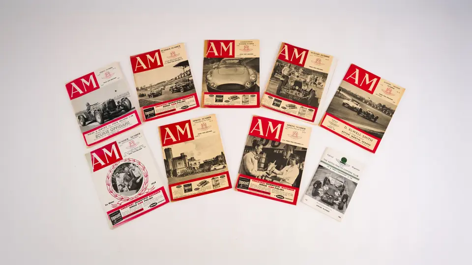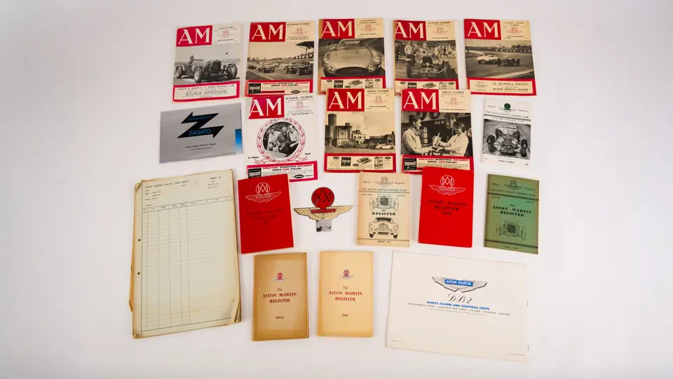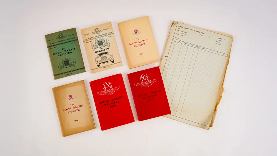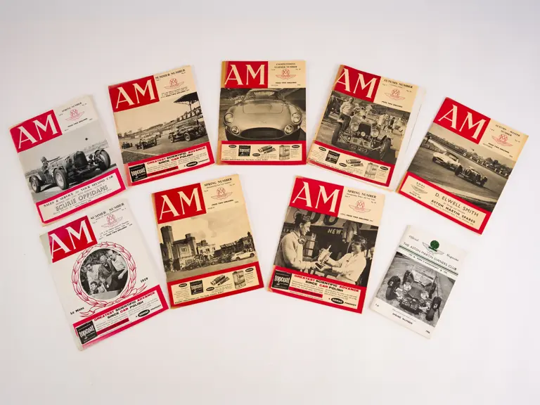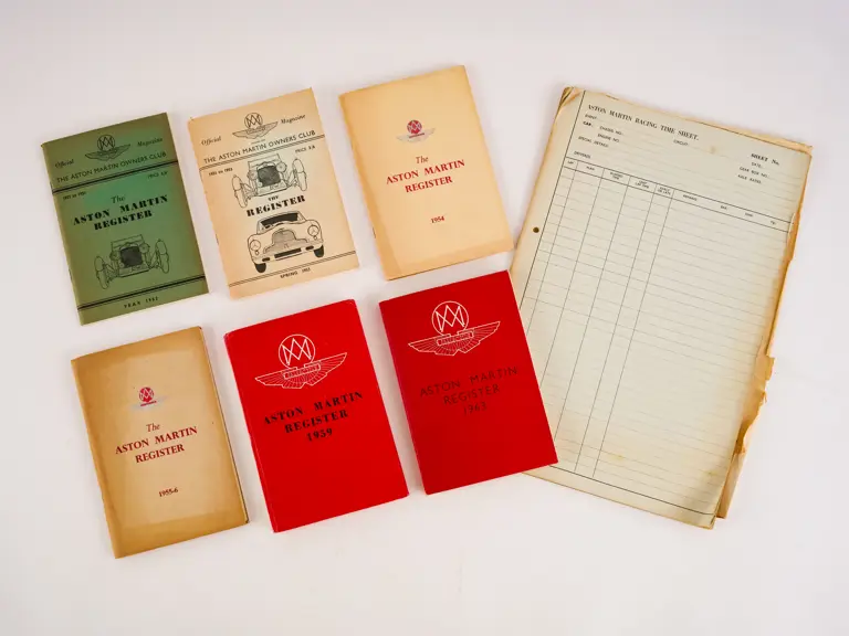 This lot includes a NOS DB2 brochure, Aston Martin Works blank lap sheets, AMOC registers and magazines.